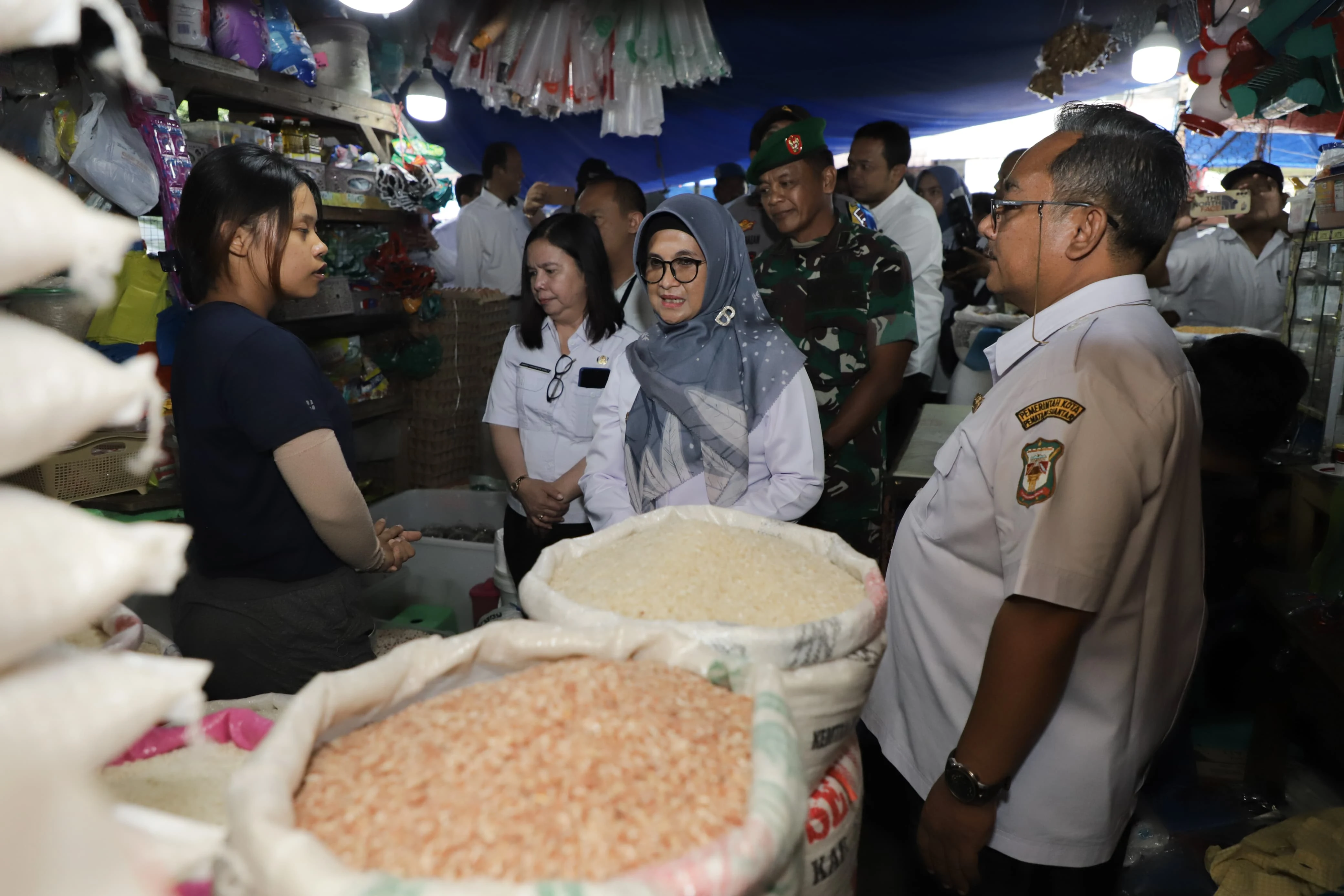 Wali Kota Pematangsiantar dr Susanti Dewayani SpA bersama sejumlah Unsur Forkopimda melakukan inspeksi mendadak (sidak) harga dan stok barang kebutuhan pokok serta barang penting pada pelaku usaha distribusi barang di Kota Pematangsiantar, Rabu (13/03/2024). Sidak yang dilakukan di hari kedua Ramadhan tersebut dilakukan di sejumlah lokasi yakni Pasar Dwikora, Kilang Padi Sentosa, Bulog, dan Pasar Horas.